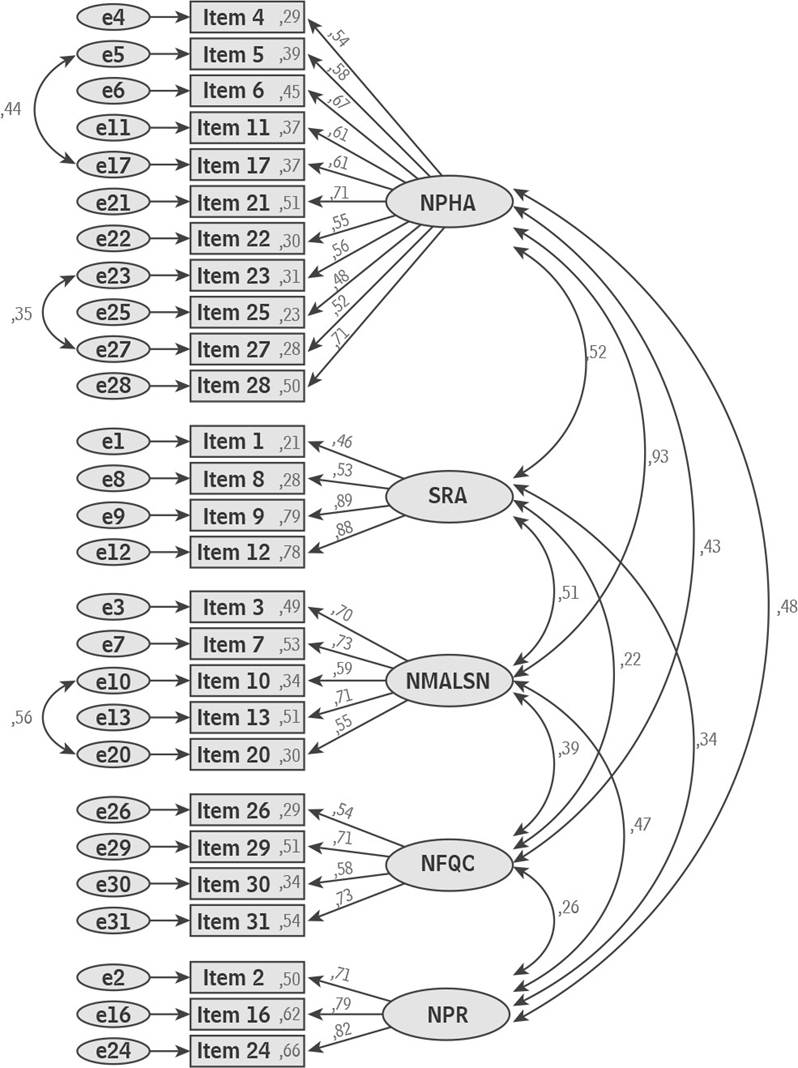 The five components identified are NPHA with 11 items, NMALSN with five items, SRA with four items, NFQC with four items, and NPR with three items. In the internal consistency analysis, the total scale had Cronbach’s alpha of 0.912, and, in the subscales, alpha was greater than 0.8, revealing excellent internal consistency.