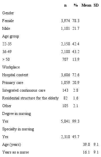 Five thousand fifty-five nurses who work in mainland Portugal participated in this study. Most participants were female (72.6 %), and 21.7 % were male (Table 1). The nurses’ age varied between 22 and 66 years (M = 39.0; SD = 9.1); the mean worked as a nurse for 16.1 years. Most professionals (99.3 %) had a degree in nursing, and 45.7 % were specialists. Most nurses work in a hospital context (72.6 %) and primary care (20.9 %).