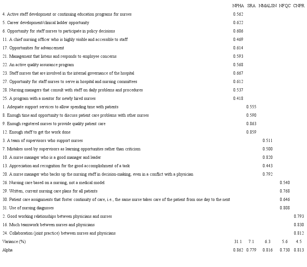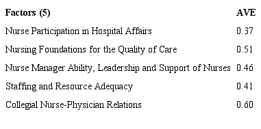 The results from the EFA presented a five-dimension solution, which is like the original scale presented by Lake 1, but the items within the factors are different. In previous studies, similar variations in item structure have been observed 6-9. These can be due to differences in culture, health care systems, and management among countries, which may influence nurses’ responses.