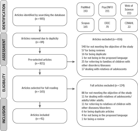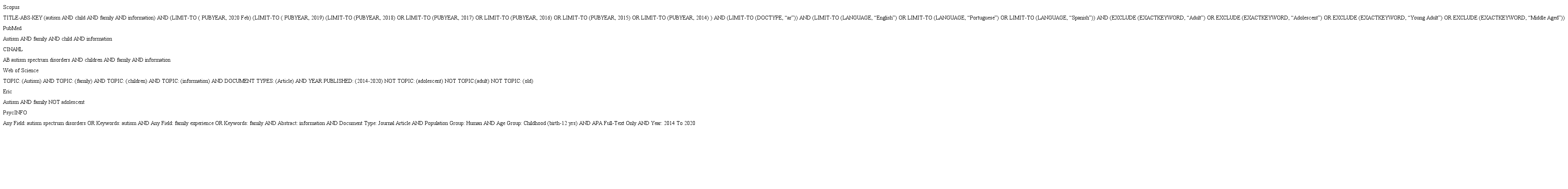 2). Establishment of the inclusion/exclusion or sample selection criteria: studies that addressed family members of children with ASD; that specified the necessary information for these family members to help them in the daily care of the child; published between January 2014 and February 2020; qualitative and quantitative research studies available in full and free of charge in Spanish, English and Portuguese, in the Scopus, PubMed (US National Library of Medicine National Institutes Database Search of Health), CINAHL (Cumulative Index to Nursing and Allied Health Literature), Web of Science, Eric (Education Resources Information Center), and PsycINFO (American Psychological Association) databases.