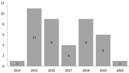 The sample consisted of 41 studies, and their characterization is shown in Table 2. As regards the year of publication of the articles: 1 (2.4 %) in 2014; 11 (26.2 %) in 2015; 9 (21.95 %) in 2016; 4 (9.75 %) in 2017; 9 (21.95 %) in 2018; 6 (14.6 %) in 2019 and 1 (2.4 %) in 2020, as shown in Figure 2. All were conducted in foreign countries: 17 (41.52 %) in the United States; 5 (12.2 %) in Australia; 3 (7.3 %) in Canada and Sweden; 2 (4.9 %) in China, the United Kingdom and Ireland; in Croatia, Spain, France, Greece, Italy, Russia and Turkey, 1 (2.4 %) article was published. Regarding the methodology, 23 (56.1 %) articles used a qualitative approach, 11 (26.8 %) used a quantitative approach, and 7 (17.1 %) used a quantitative and qualitative approach. With regard to the language of the studies, 40 (97.6 %) are in English and 1 (2.4 %) in Spanish.