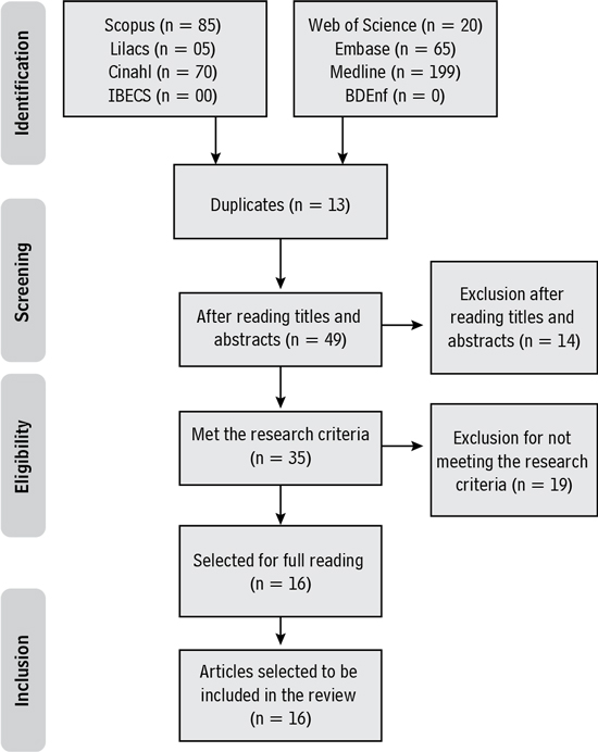 After a careful selection, 16 studies made up the final sample of articles, seven of which were published in journals indexed in Scopus, one in Web of Science, one in Embase and seven in Medline, all published in 2020 and in English. The other databases searched did not have studies selected to compose this review.