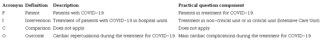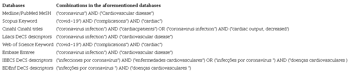 The selection phase of the studies took place in the first half of June 2020, by means of an electronic search paired with original articles and case reports, given the pandemic nature of the disease, which answered the research question, by using the Pico22 (acronym for patient, intervention, control or comparison and outcomes) strategy, according to Table 1, to construct the following question: Is there scientific evidence in the literature about the main cardiac complications in patients with COVID-19 during hospital treatment?