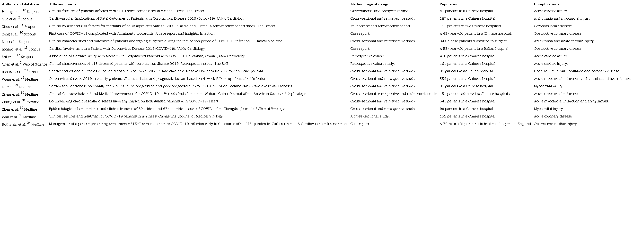 As for the type of study, 14 were observational studies (cohort or cross-sectional) and three were case reports. The sample consisted of 14 studies developed in China, two in Italy, and one in England. Regarding the objectives, four were related to cardiac complications of patients with COVID-19, seven to cardiovascular complications, naming cardiac complications, and the others referred to complications in general, with emphasis on adverse cardiac events during treatment.