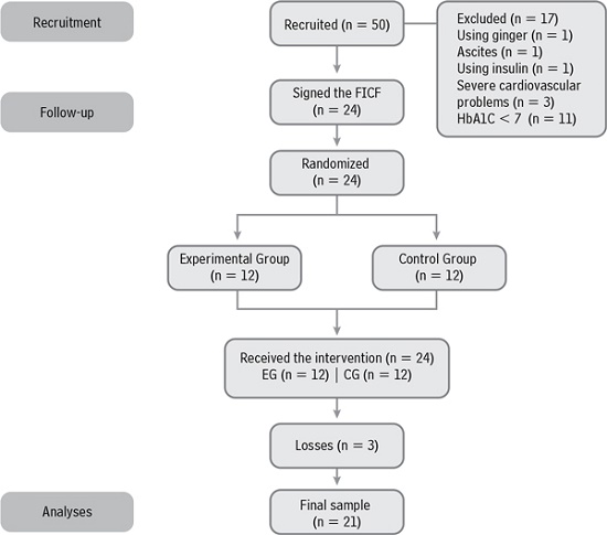 As this is a pilot study in which the researchers involved sought to evaluate the effectiveness and feasibility of the intervention proposal, in addition to estimating the sample size for a future study, the sample of this research was selected for convenience. Of the 50 patients recruited, only 41 were interested in participating and, of these, 17 were excluded for the following reasons: one used daily ginger supplementation; one had ascites; one was on insulin therapy; three reported having severe heart problems, and 11 had HbA1C results < 7 %. Thus, 24 participants were randomized.