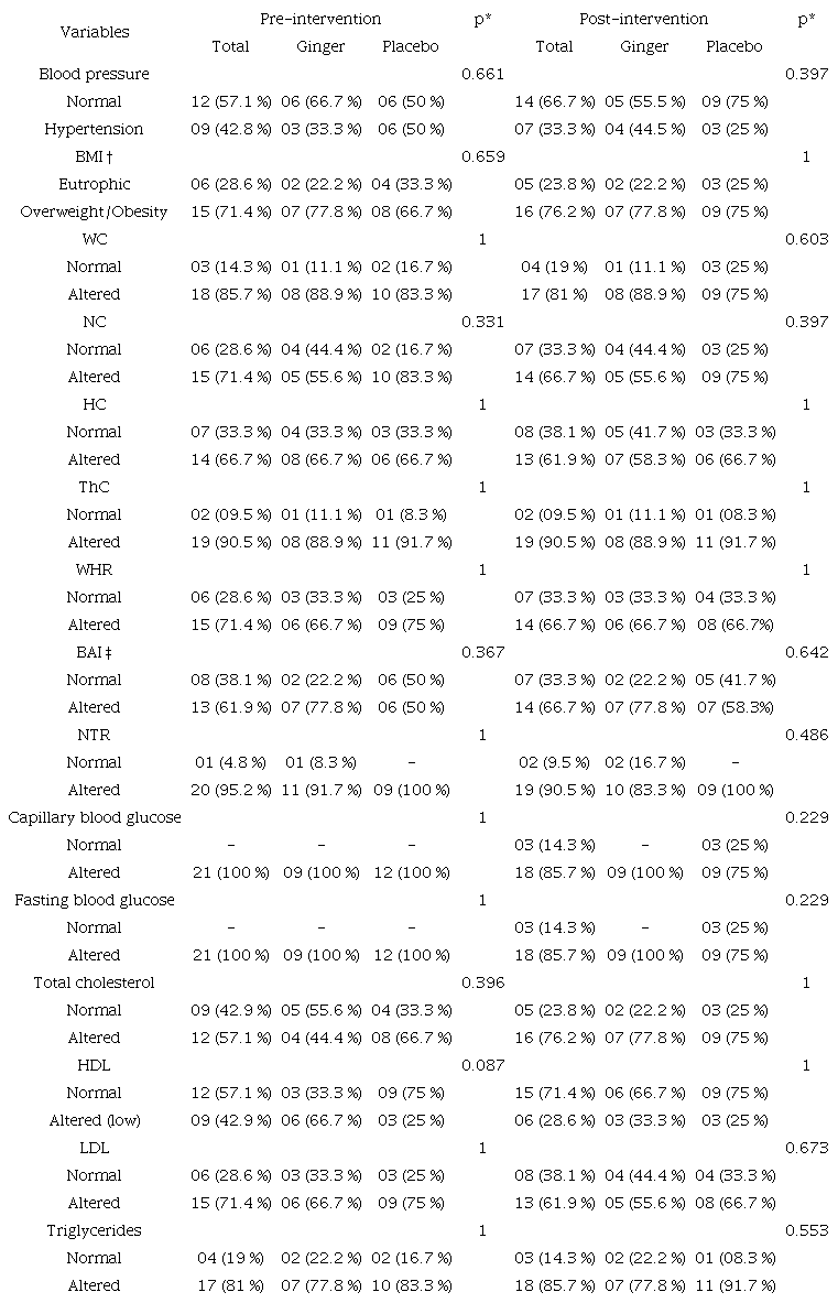 Results: A total of 21 participants were included in the study. The use of 1.2 g of ginger resulted in noticeable reductions in the anthropometric and lipid levels in 30 days of follow-up, but it did not reduce the glycemic levels.