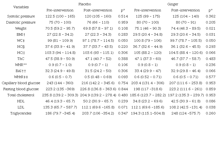 As for the mean values of the anthropometric and laboratory variables, the participants who used ginger had reductions in weight (75.1-74.4/p = 0.021), BMI (29.5-29.3/p = 0.031), WC (100.8-99.7/p = 0.050), NC (36.7-36.1/p = 0.293), HC (105.0-104.4/p = 0.066), ThC (47.1-46.7/p = 0.483), BAI (33.41-32.92/p = 0.066), HDL (37.78-45.08/p = 0.086), and LDL (113.99-108.50/p = 0.038) (as well as a 95 % confidence interval) (Table 2).