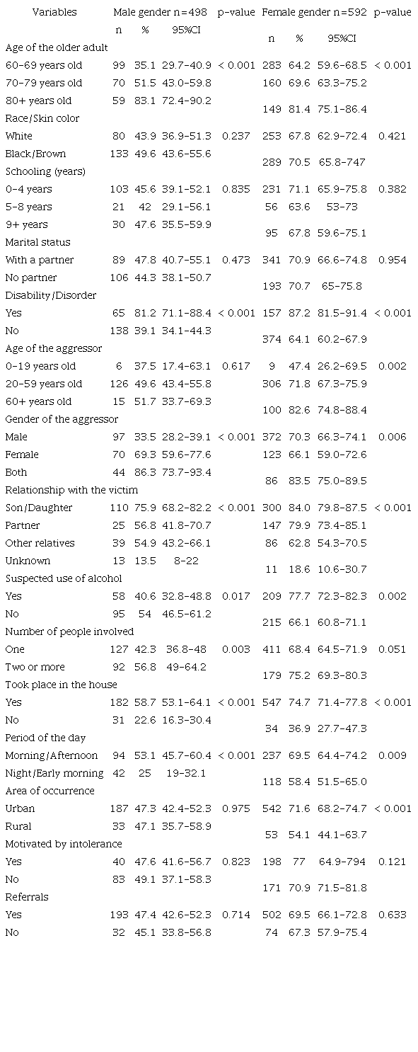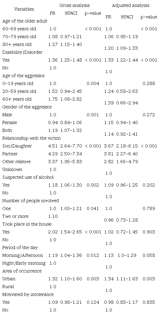 The notification of violence against older adults was analyzed according to the outcome of interest: history of repeated violence (yes/no) stratified by gender (male/female). The independent variables were the following: characteristics of the victims - age (from 60 to 69 years old/from 70 to 79 years old/80 years old or more), race/skin color (white/black-brown), schooling (from 0 to 4 years/from 5 to 8 years/9 years or more), marital status (with a partner/no partner) and presence of disability/disorder (yes/no); characteristics of the aggressor - age (from 0 to 19 years old/from 20 to 58 years old/older than 60 years old), gender (male/female/both), relationship (daughter/son/partner/other relatives/unknown), suspicion of alcohol consumption (yes/no) and number of people involved (one/two or more); characteristics of the aggression - if it took place in the house (yes/no), period of the day (morning-afternoon/night-early morning), area (urban/rural), motivated by intolerance (yes/no) and referrals (yes/no).