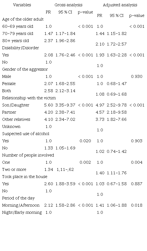 In Table 3, we can see the adjusted analysis of repeated violence against male older adults, in which it is possible to notice that the age of the older adult, disability/disorder, relationship with the victim, the number of people involved, and period of day of the occurrence were associated with the problem. Older adults aged 80 years old or more presented 2.10 times more prevalence of repeated violence (95 % CI: 1.72-2.57), which was also more prevalent among older adults with disability or disorders (PR: 1.93; 95 % CI: 1.63-2.28). Among male older adults, this problem was almost five times more perpetrated by children (PR: 4.97; 95 % CI: 2.52-9.78) and/or female partners (PR: 4.57; 95 % CI: 2.18-9.58), involving two or more people (PR: 1.40; 95 % CI: 1.11-1.76) and occurring during the day (PR: 1.41; 95 % CI: 1.06-1.88).