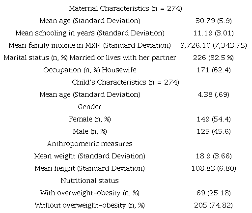 There was participation of 274 dyads (mother-child), with a mean maternal age of 30.79 years old (SD = 5.9) and a mean schooling of 11.19 years of study (SD = 3.01); 82.5 % (n = 226) lived with their partner; and 62.4 % (n = 171) were housewives. Regarding the children, their mean age was 4.38 years old (SD = 0.69), 54.4 % (n = 149) were female, mean weight of 18.90 kg (SD = 3.66), mean height of 108.83 cm (SD = 6.80), and 25.2 % (n = 69) with overweight-obesity; the information is presented in Table 1.