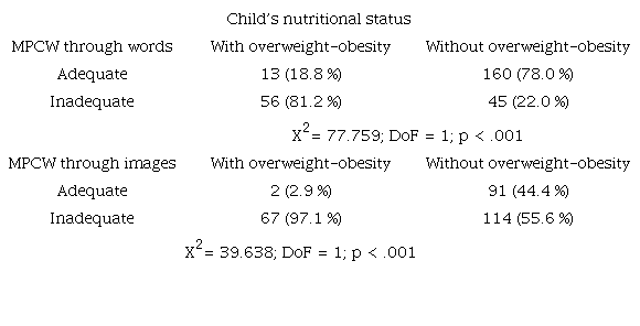 According to Objective 1, adequate MPCW through words was found in 18.8 % (n = 13) of the mothers of children with overweight-obesity and in 78.8 % (n = 160) of the mothers of children without overweight-obesity (X2= 77.759; DoF = 1; p < .001). Through images, adequate MPCW was found in 2.9 % (n = 2) of the mothers of children with overweight-obesity and in 44.4 % (n = 91) of the mothers of children without overweight-obesity (X2= 39.638; DoF = 1; p < .001); the information is presented in Table 2.