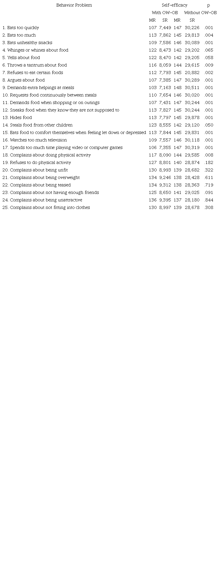 According to Objective 3, it was found that the mothers of children with overweight-obesity presented less self-efficacy when compared to the mothers of children without overweight-obesity to deal with 15 of the 25 behavior problems; the information is presented in Table 4.