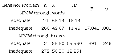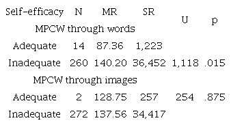 Regarding SE, it was found that, when MPCW is adequate, the mothers’ SE is lower (MR = 87.36) when compared to the mothers with inadequate MPCW (MR = 140.20), and the difference was significant (U = 1,118; p = .015). No significant difference was found in MPCW through images; the information is presented in Table 6.