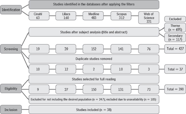 This process resulted in 427 studies, but after excluding 37 duplicates, 390 studies were read in full. After careful reading, 247 studies were excluded for not addressing the desired population (infants aged 0 to 6 months) and 105 were excluded for not being available for download. Thirty-eight articles were included in the final sample. The flowchart of the Preferred Reporting Items for Systematic Review and Meta-Analysis (Prism) was used to illustrate the process of study identification, screening, eligibility, and inclusion, as shown in Figure 1.