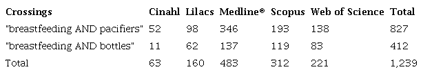 A paired search was carried out by two authors in March 2020, in the Medical Literature Analysis and Retrieval System Online (Medline®), Cumulative Index to Nursing and Allied Health Literature (Cinahl), Latin American and Caribbean Health Sciences Literature (Lilacs), Web of Science, and Scopus databases. The following controlled descriptors of the Medical Subject Heading (MeSH) were used: "breastfeeding", "pacifiers", "breastfeeding", "bottles". Two crossings were implemented using the Boolean operator "AND". A total of 1,239 references were identified in the databases, with the respective crossings (Table 2).