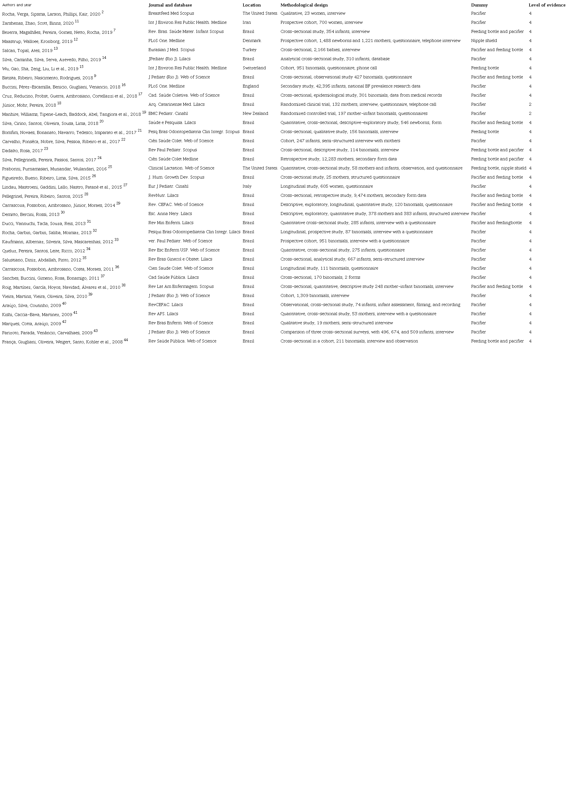Data were collected with the aid of a previously defined table, which included: author, year, journal/database, location, methodological design, level of evidence, and types of artificial nipples.