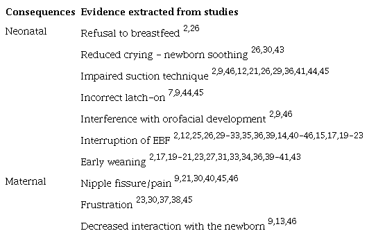 Conclusiones: las consecuencias de la oferta de pezones artificiales a los bebés em la lactancia son, en su mayoría, negativas y relacionadas con el neonato, como el desmame temprano y el rechazo al seno, la succión perjudicada, el agarre inadecuado, la interferencia en el desarrollo orofacial y la interrupción de la lactancia materna exclusiva. Las madres que ofrecieron pezones artificiales a sus hijos están más propensas a sentir dolor, tener fisura mamilar, frustración y reducción de la interacción con su hijo.