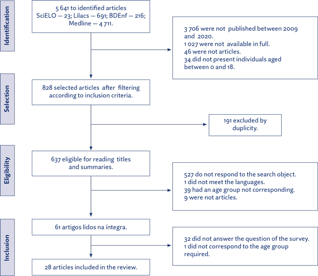 A total of 5,641 articles were identified, which, after applying the filters according to the inclusion criteria, resulted in 828. After the disposal of the manuscripts in duplicate, 637 (11/SciELO, 177/Lilacs, 26/BDEnf and 423/Medline) had their titles and abstracts read exhaustively, to verify whether they answered the study question. A good of 576 articles were excluded because they were not in Portuguese, English or Spanish (1 article); do not present individuals aged between 0 and 18 years (39 articles); not to be articles (9 works); not to respond to the research objective (527 articles).