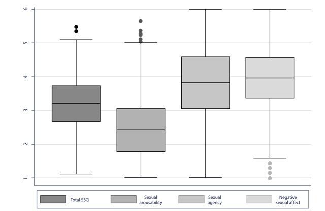 The Kolmogorov-Smirnov test for assessing normality was significant for the SSCI (p = .001). The median score on the SSCI among the participant population was 3.17, while the sexual arousability factor was 2.52, the sexual agency factor was 3.8, and the negative sexual affect factor was 3.9 (Figure 1).