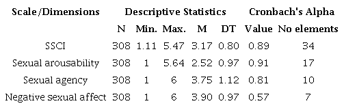 Results: Inventory of 34 items with three dimensions; exploratory factor analysis confirmed the three factors with a total variance of 43.261 %. The instrument reported internal consistency of α = 0.89 for the following dimensions: sexual arousability (0.908), sexual agency (0.812), and negative sexual affect (0.572).