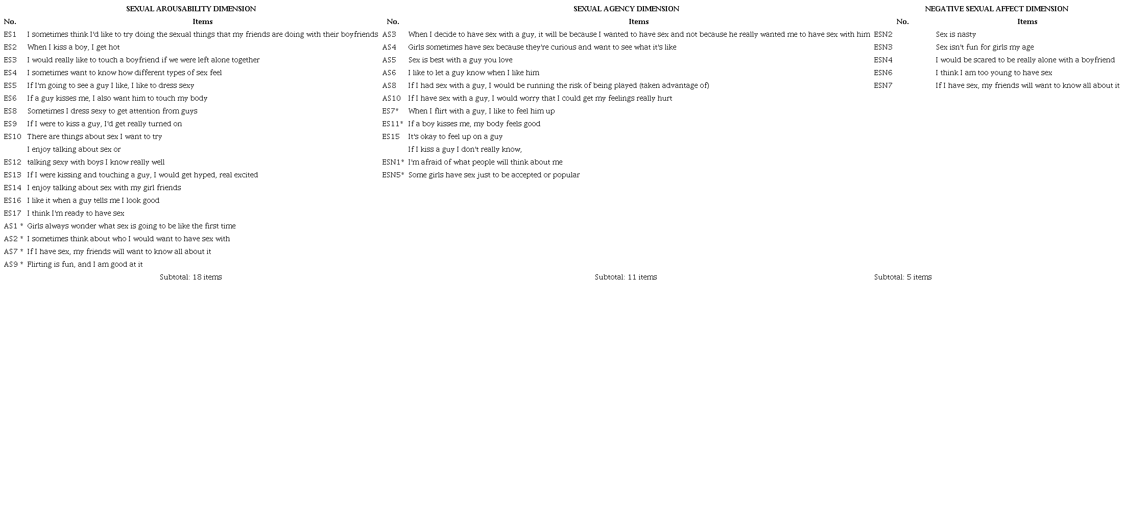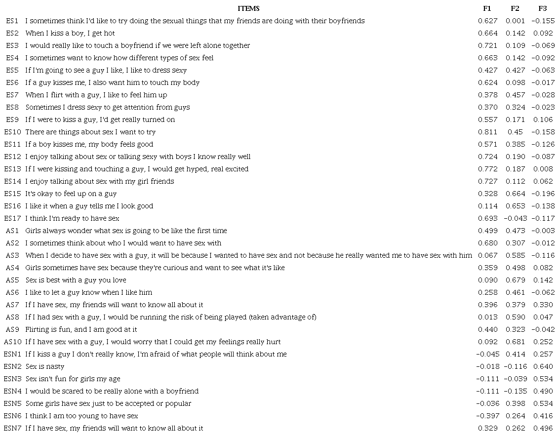 Considering that for the sexual arousability factor, which included items between 1 and 17 in the original version, three items, namely, 7, 11, and 15, are now excluded and subsequently assigned to factor two. In addition, items AS1, AS2, AS7, and AS9 are moved from factor two (sexual agency) to factor one, leaving factor one with 18 items. Therefore, factor two keeps six original items, plus items 7, 11, and 15 from factor one, and items ESN1 and ESN5 from factor three (negative sexual affect), totaling eleven items. Lastly, factor three keeps five items from the original scale and item ES5, which has a similar value within two factors left there according to the original scale. Table 4 shows the scale with the rearranged items.