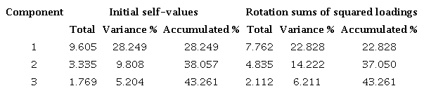 Using factor analysis with the extraction of the principal components and varimax rotation of the three factors, we considered the items with a value higher than 0.4. When revising the communality of the 34 items, we discovered that not all of them corresponded with the initial factor (Table 2).