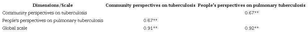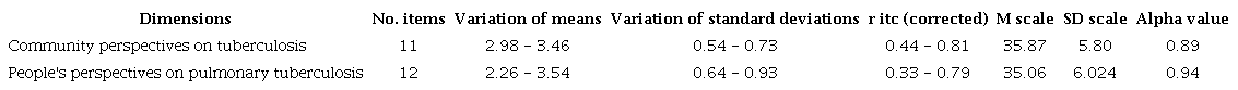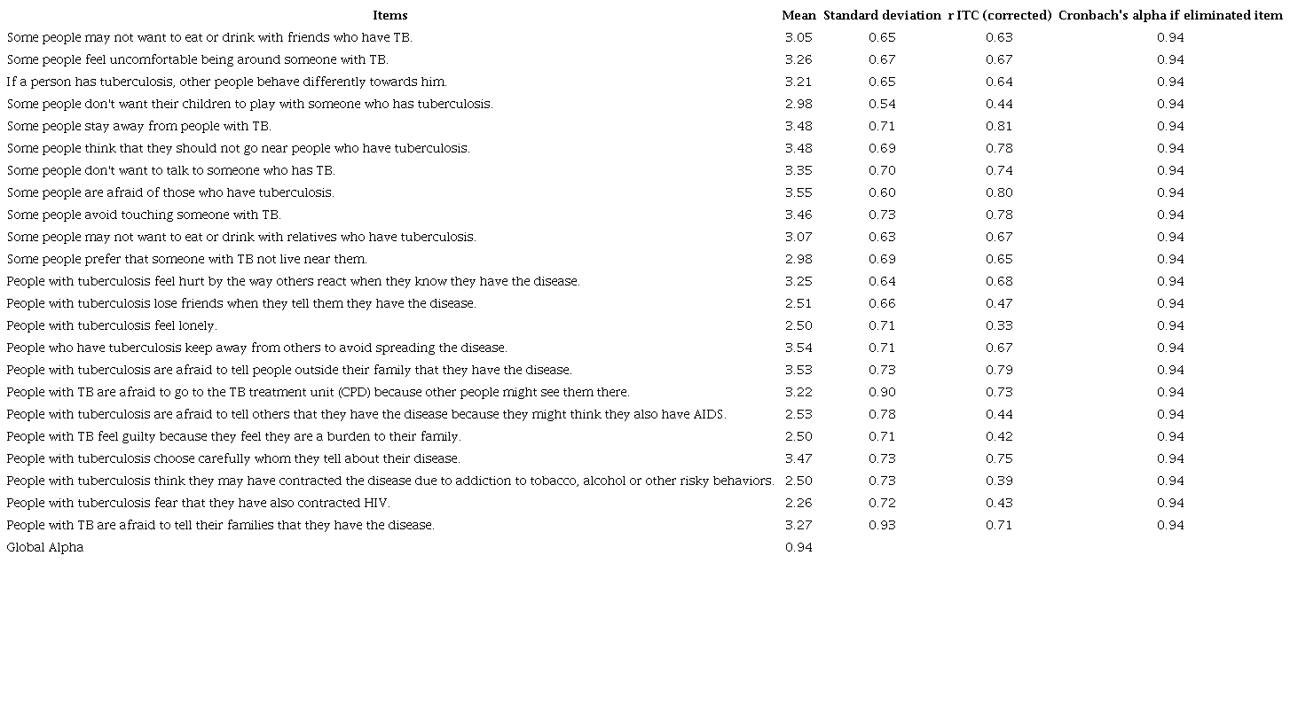 The two dimensions of the TRSS showed good internal consistency (values equal to or higher than 0.89), with the dimension "Community perspectives on tuberculosis" being more consistent (0.94). Means ranged from 2.26 to 3.54 and standard deviations from 0.54 to 0.93. As for the corrected correlation coefficients of each item with the total dimension of belonging, the values were very satisfactory (between 0.44 and 0.81 for the dimension "Community perspectives on tuberculosis" and between 0.33 and 0.79 for the dimension "Person's perspectives on pulmonary tuberculosis").