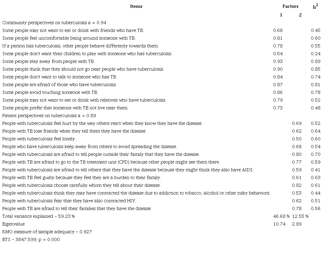 The analysis of the correlation matrix between the 23 items and the total scale showed significant indices (p < 0.001) with significant correlations. The factorial organization of the items in two dimensions ("Community perspectives on tuberculosis" with 11 items and "Patient perspectives on tuberculosis" with 12 items, respectively) together, explain 59.23 % of the total variance of the scale.