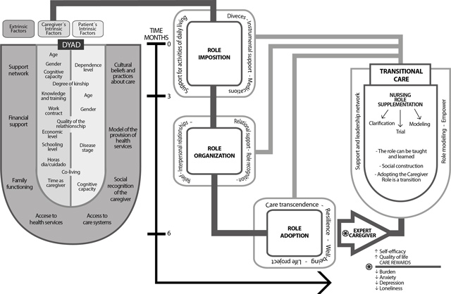 When determining that role adoption is related to a caregiver transition process, an exploration was made from different nursing theoretical approaches to link concepts that met the definition of this concept. In this respect, Meleis’ mid-range Theory of Transitions 12 was the one that could best describe this construct; therefore, it will be the theoretical grounds to develop the theory herein presented.