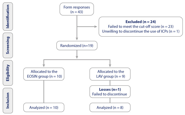 After the study was announced, 43 professionals expressed interest in participating in the research, and only 19 met the eligibility criteria. Of those 19, only one was excluded from the analysis for not discontinuing the use of the EO at the end of the 21-day intervention (Figure 1).