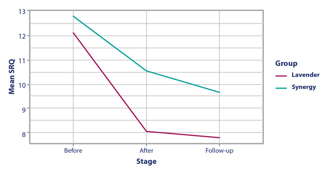 The mean SRQ-20 score was similar between groups (p = 0.893), with different variances according to Levene’s test (p = 0.041). There was a reduction in SRQ-20 scores from the pre- to post-intervention stages in both groups, with a non-significant residual effect from post-intervention to follow-up, but with the maintenance of the effect reached within this period. When comparing the pre-intervention stage with the follow-up, a significant reduction was observed in the LAV group (p = 0.033) but not in the EOSIN group (p = 0.082).