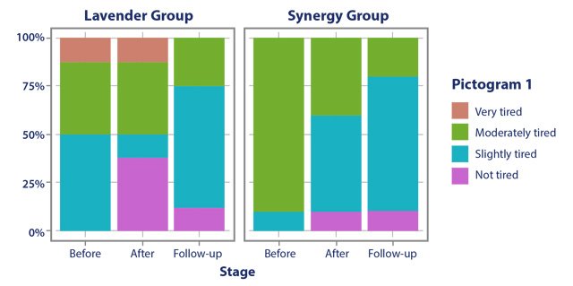 Materials and Methods: This is a quasi-experimental pilot study conducted in 2020. The professionals were randomized in Group 1 - lavender, and in Group 2 - lavender and other EOs synergy. The instruments were validated in Brazil, namely the Self-Reporting Questionnaire (SRQ-20) and the Fatigue Pictogram, which were applied at three moments: before the intervention, after 21 days of intervention, and three weeks after the end of the intervention follow-up. The data were evaluated using Pearson’s x2 test or Fisher’s exact test (dichotomous variables) and Student’s t-test or Mann-Whitney test (continuous variables).