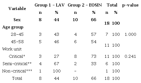 However, when comparing groups, EOSIN presented a higher number of professionals from critical units (n = 8; 73 %) and LAV from inpatient units (n = 4; 67 %). Regarding age, both groups presented a mean of 47.5 (± 10.2) years, but different medians, namely 50.5 and 45.5 years, in the LAV and EOSIN groups, respectively (p = 0.829).