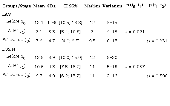 The effect size between pre- and post-intervention was larger in the LAV group with a huge effect size of 1.56 and a relative reduction of 33 %, while, in the EOSIN group, a medium effect size of 0.56 and a relative reduction of 17 % were observed.