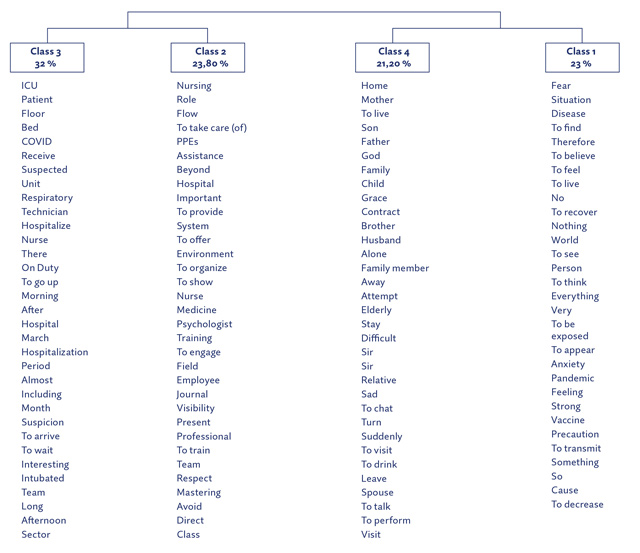 In the lexical analysis of the texts, a dendrogram was generated to display the classes formed by the 1,785 (88.1%) analyzable text segments (Figure 3). Thus, four classes emerged, which were categorized based on the theoretical framework, named as follows: “category 1 - nursing professionals’ feelings regarding the pandemic,” “category 2 - nursing professionals’ concern that their family members may become ill during the pandemic,” “category 3 - precautions with the care provided to patients with COVID-19,” and “category 4 - the nurses’ role and work with the multi-professional team in the care provided to patients with COVID-19.”