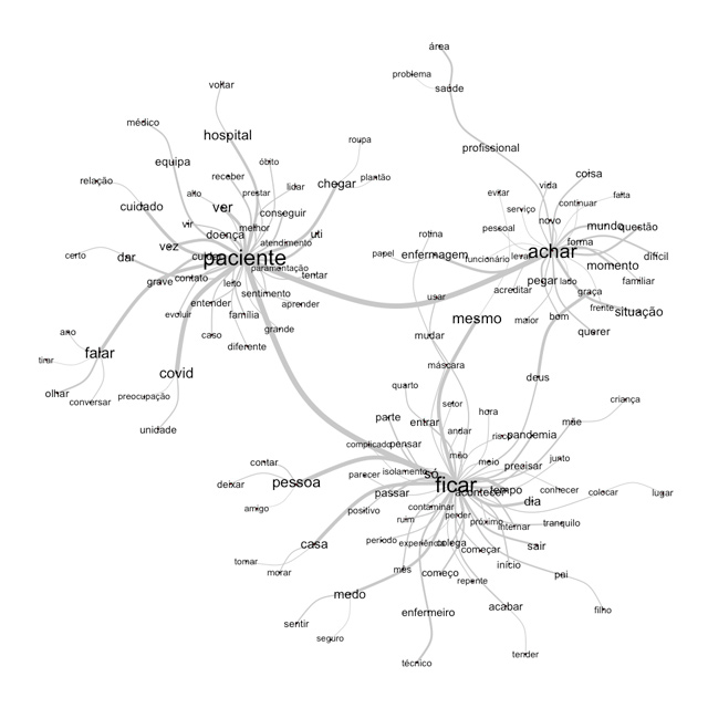 It is worth noting that, in the reports, the nursing care provided to people with COVID-19 demands increased workloads, especially when they are in a severe condition. These aspects are in line with the existing connections between the words ‘paciente’ (‘patient’), ‘COVID’, ‘grave’ (‘severe’), and ‘cuidado’ (‘care’). This indicates that contaminated patients require specialized care based on protocols that ensure the safety of professionals, but that, even following the routine, feelings such as fear, insecurity, and exposure of their families to contamination emerge, which have led several professionals to distance themselves from their homes. A study conducted in three Belgian hospitals aimed to evaluate the nurse-patient relationship required by COVID-19 patients and to identify the factors that influence nursing in this context (20). The study concluded that patients admitted to ICUs for COVID-19 require longer nursing care than other medical conditions, requiring an average ratio of one nurse for each patient.