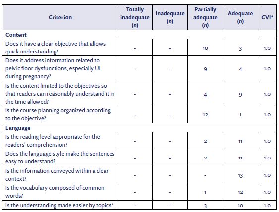 According to all categories evaluated by the specialists, the educational device can be considered straightforward in conveying information and logical in its sequence, with compatible visual and linguistic aspects, which are helpful for understanding and reflecting upon urinary loss during pregnancy. Studies 28,29 have shown that educational resources must be attractive tools, have adequate language for the target audience, and be cohesive and coherent in their structure and objectives with a theme following a logical succession to encourage and promote changes in the actions of the professionals being trained.