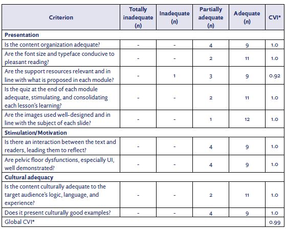 The evaluation by the design specialists is presented in Table 2. The specialists suggested some modifications: dynamic improvement of the lessons from slides in video-slides; improvement of the page layout also to be available for smartphones, and reformulation of some theoretical contents since they were not limited to gestation-as proposed by the course theme-, also covering the moment of childbirth. All recommendations were reviewed in the pre-final version of the online course.