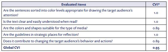 Table 1 shows that all variables and items analyzed by the content specialists had an average CVI higher than the established cutoff point.