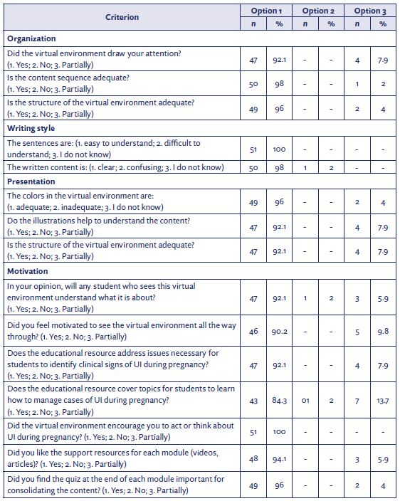 From the specialists’ evaluation, a second version was created and submitted for external validation. This evaluation aimed to verify the adequacy of the organization, writing style, presentation, and motivation of the technological product to the course objectives from the target audience’s perspective.