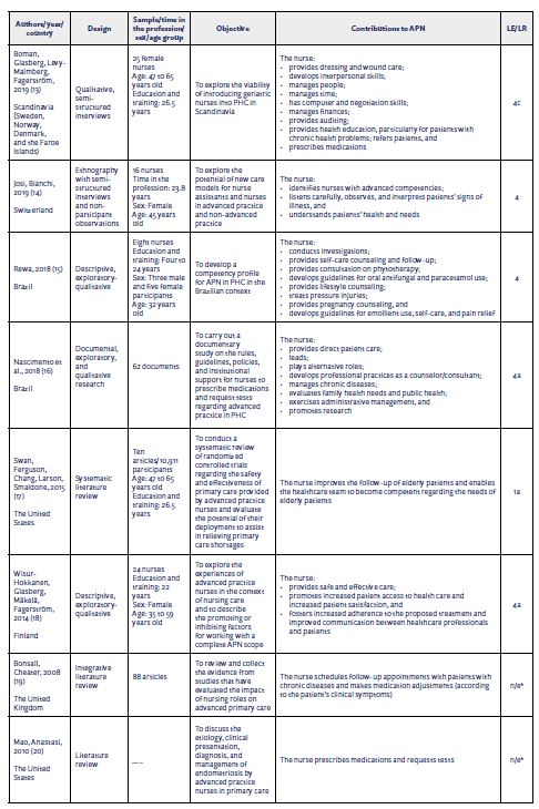 In light of these findings, we emphasize the implementation of advanced practices in all contexts of health care and the consolidation of structures that enable nurses to work with autonomy and safety. Finally, we encourage new studies to demonstrate the results of APN in PHC based on cross-cultural evaluative processes and the emergence of indicators that measure the effectiveness of the contributions mentioned and their implications in healthcare promotion.