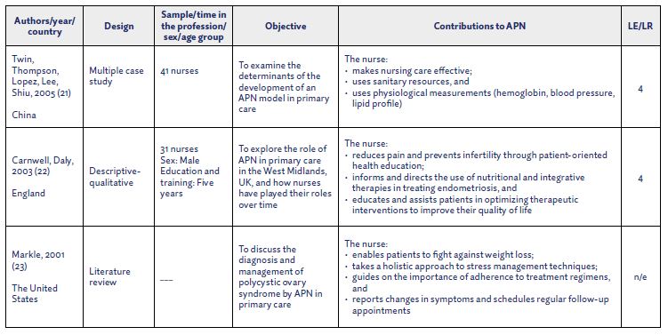 Results: The contributions mentioned by the studies regarding advanced practice nursing were divided into three subcategories, as follows: care, educational or management, and preventive practices. They concern autonomy, specialized clinical skills, therapeutic counseling, and patient-centered interaction. Some strategies to implement advanced practice are related to continuing education, practice management, self-care, and disease management.
