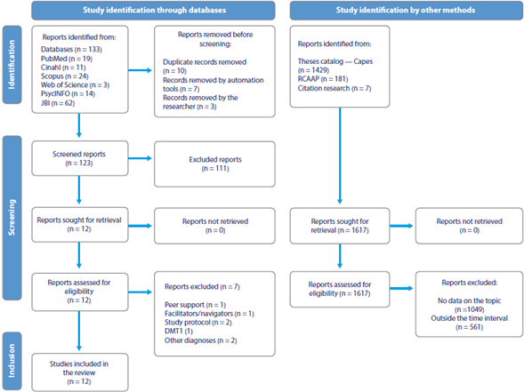 The eligibility criteria adopted were: studies published with the proposed theme in English, Spanish, and Portuguese; complete articles, theses, and dissertations available online; any study, regardless of methodological design (qualitative, quantitative, or mixed), that explores the participant’s experience in programs aimed at supporting the self-management of DM through social support and led by nurses; studies with participants aged 18 or over, diagnosed with T2DM, conducted in the primary health care setting, and with program interventions led by nurses.