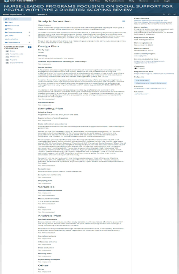 The main objective of this review is to map the nature and extent of published scientific production and grey literature related to nurse-led programs aimed at supporting self-management of care of people with T2DM through social support. It has the following specific objectives: To list the programs focusing on social support for people with T2DM led by nurses; to describe the contents of these programs; and to identify the results related to them.