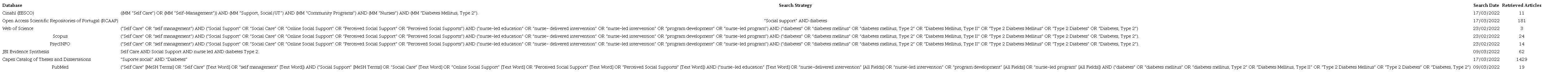 The search for studies was performed in the following databases: Web of Science, Medline (PubMed), Cinahl (EBSCO), Capes Catalog of Theses and Dissertations, Scopus, JBI Evidence Synthesis, PsycINFO (APA), and Open Access Scientific Repositories in Portugal between February 23 and March 17, 2022. Afterward, the reference lists of the included studies were manually searched to identify any relevant studies. The search strategies used for each database are shown in Table 1 and were devised with the assistance of two librarians with expertise in the health field and systematized reviews.