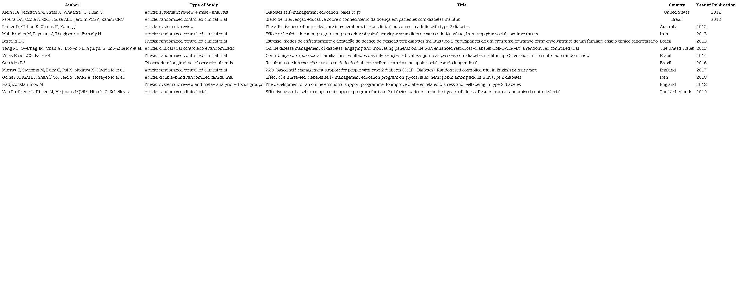 Resultados: 12 estudos incluidos, publicados nos Estados Unidos, na Inglaterra e no Ira, com foco no suporte social de apoio a autogestao de pessoas com DM2 e com concentracao em locais de atendimento as pessoas com doencas cronicas. Observou-se que a maioria dos programas liderados por enfermeiros e implementada em paises desenvolvidos e apresenta como caracteristica principal enfase na teoria social cognitiva. O publico se caracterizou por ser maioria mulheres, faixa etaria de adultos maiores de 22 anos, com baixa escolaridade.