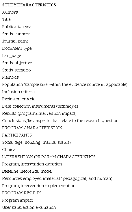 A form was designed by the author to extract the data. A pretest was then carried out to assess the need for adjustments. The data extracted included author, title, publication year, study country, journal name, document type, language, study objective, study setting, methods, population/sample size, inclusion criteria, exclusion criteria, collection instrument/technique, program results/impacts, conclusions, participants’ social characteristics, participants’ clinical characteristics, program/intervention duration, core theoretical model, resources used, program implementation, and user satisfaction assessment.
