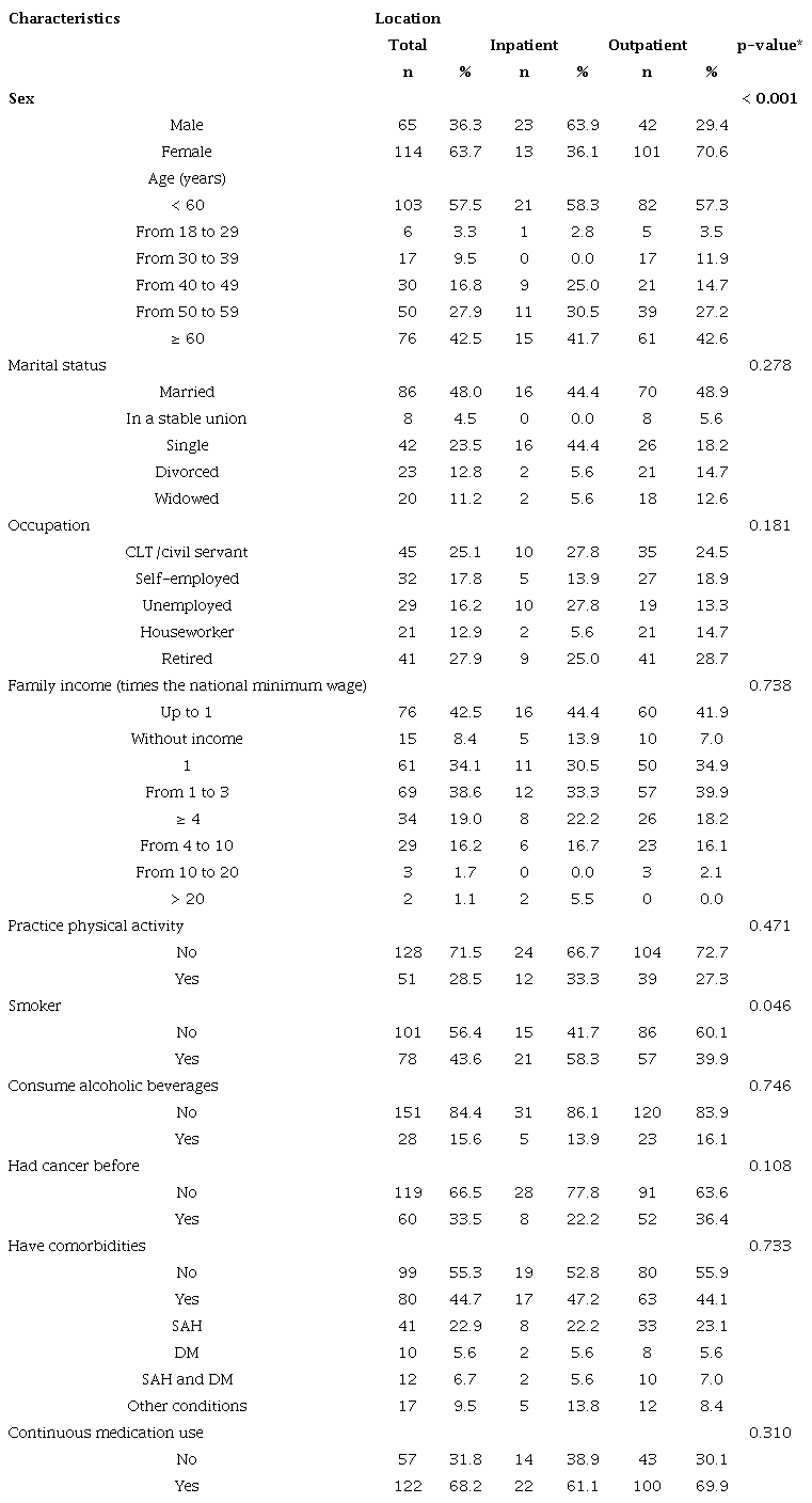 Of the 179 study participants (total sample), 114 (63.7 %) were female, 103 (57.5 %) were under age 60, 94 (52.5 %) were married or in a stable union, and 145 (81.1 %) had an income of up to three times the Brazilian minimum wage. In terms of clinical data, 99 (55.3 %) participants stated that they did not have any comorbidities; of those who did, a total of 41 (22.9 %), systemic arterial hypertension was the most common; 122 (68.2 %) of them reported being on continuous medication (Table 1).