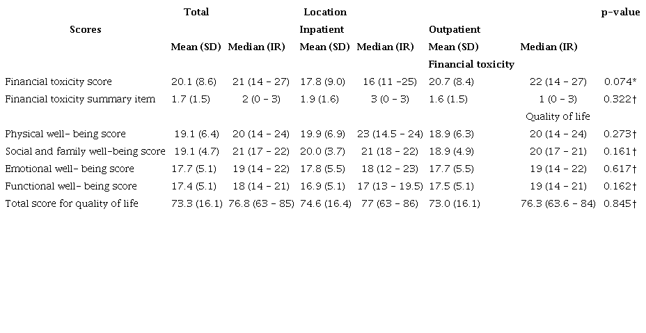 The data was analyzed using descriptive (mean, standard deviation) and inferential (t-Student or Mann-Whitney tests) analyses. The absolute and relative frequencies of sociodemographic and clinical characteristics were presented for the sample as a whole and were stratified by data collection site. Statistical differences were assessed using Pearson’s chi-squared test. Means and standard deviations (SD), medians and interquartile ranges (IR) of the financial toxicity and HRQoL scores and their respective domains were presented for the sample as a whole and were stratified by data collection site.