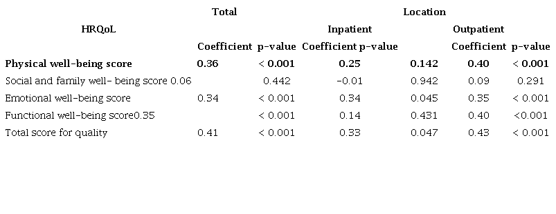When relating financial toxicity to HRQoL, the Spearman correlation coefficient found in the total sample was 0.41 and the p-value was <0.001, which means there was positive significance. Considering the samples separately, the correlation in the inpatient sector was 0.33 with a p-value < 0.047 while in the outpatient sector, it was 0.43 with a p-value < 0.001.